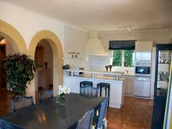 The entrance hall into the villa leads into an open plan living room, dining room and American style kitchen, separated by Tosca archways. The living room is bright and tastefully furnished, and offers satellite television and a CD player for your enjoyment. The kitchen is equipped with all 'mod-cons' including a microwave and a dishwasher. There is also a separate utility room housing a washing machine. The dining room has seating for 6 and leads into the covered naya, also furnished to a high standard, where again you can enjoy the views or watch the children playing in the pool.